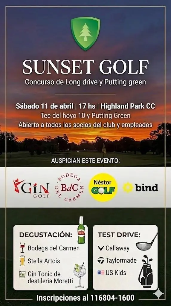 Estimados socios los invitamos a participar de la primera edición de SUNSET GOLF. Sábado 11 de abril a las 17 hs. Por favor inscribirse en la oficina de golf.